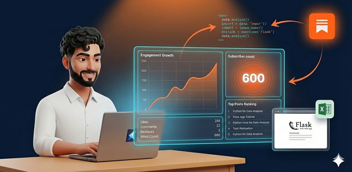 Create a Flask web app that shows Substack analytics from my code. Use Bootstrap for styling. Display: - Subscriber count - Post performance - Top content -Publishing frequency - Engagement rates