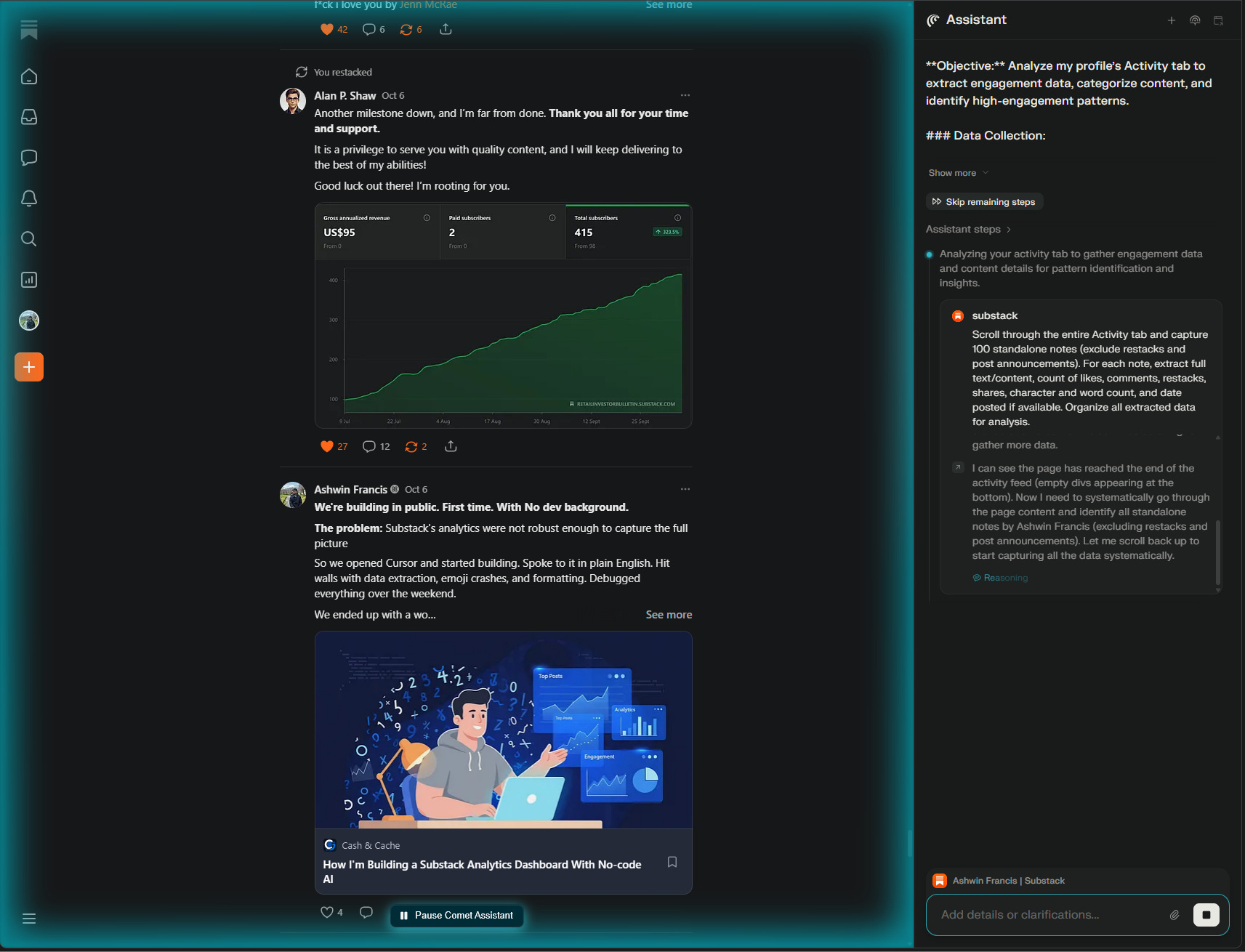 What better way to test out Comet than have it spend time with me in my new favorite corner of the internet - Substack. I took Perplexityâs promise literally and made Comet my personal AI assistant for our Cash & Cache newsletter. Instead of âalt-tabbingâ between Perplexity and Claude. I would use Comet only for all AI tasks for the newsletter.