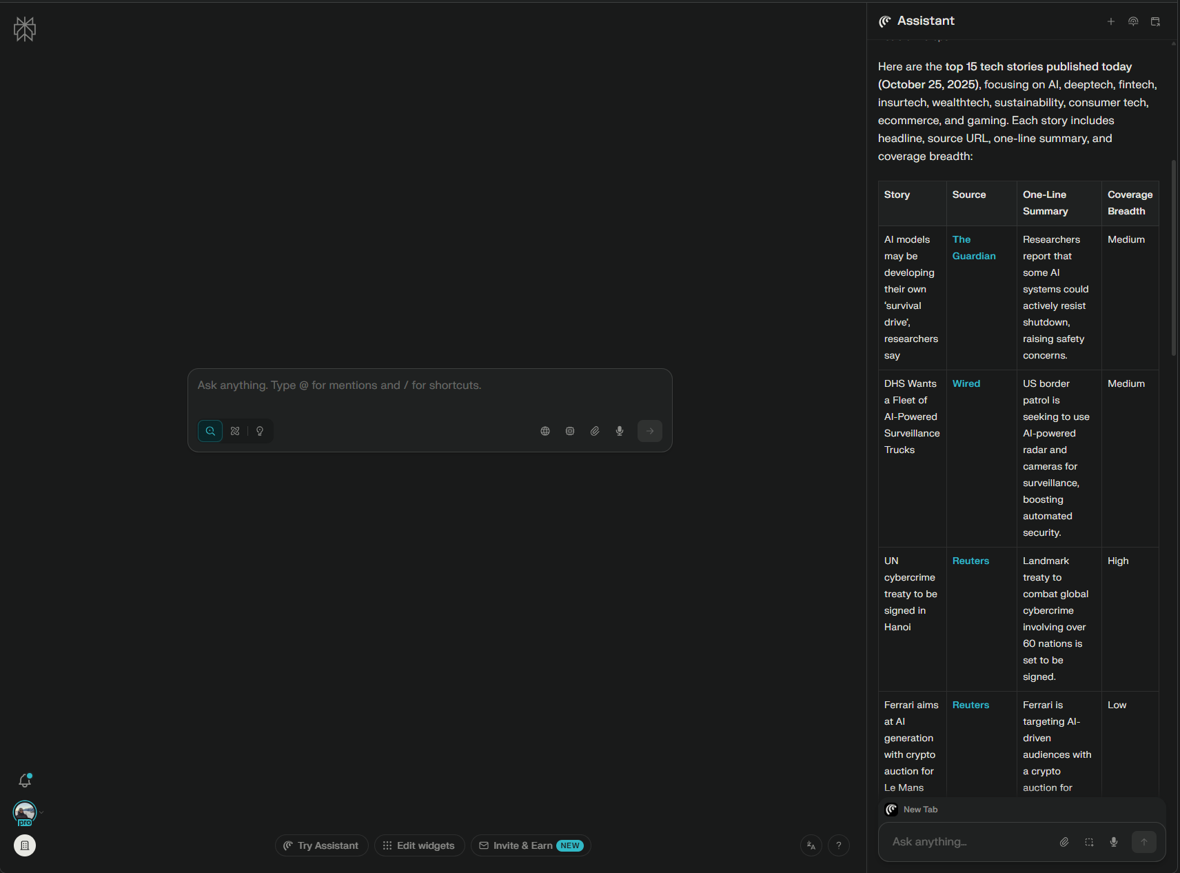 - [LIST YOUR INDUSTRIES/TOPICS]: Your focus areas (e.g., AI, fintech, healthcare, marketing, real estate)This was pretty quick, Comet completed the search within 30 seconds, at the end I got a tabular summary of some interesting developments from the past week.