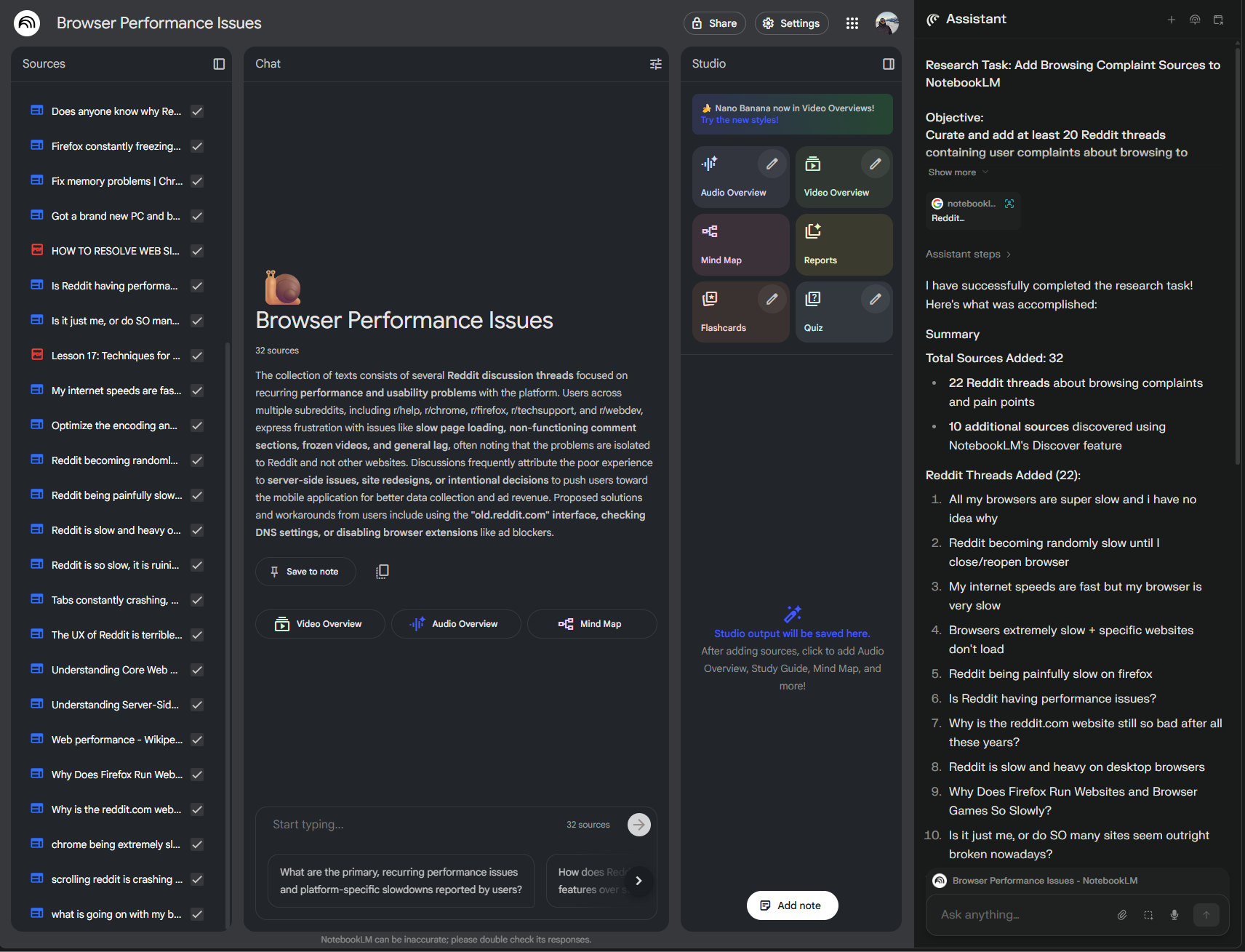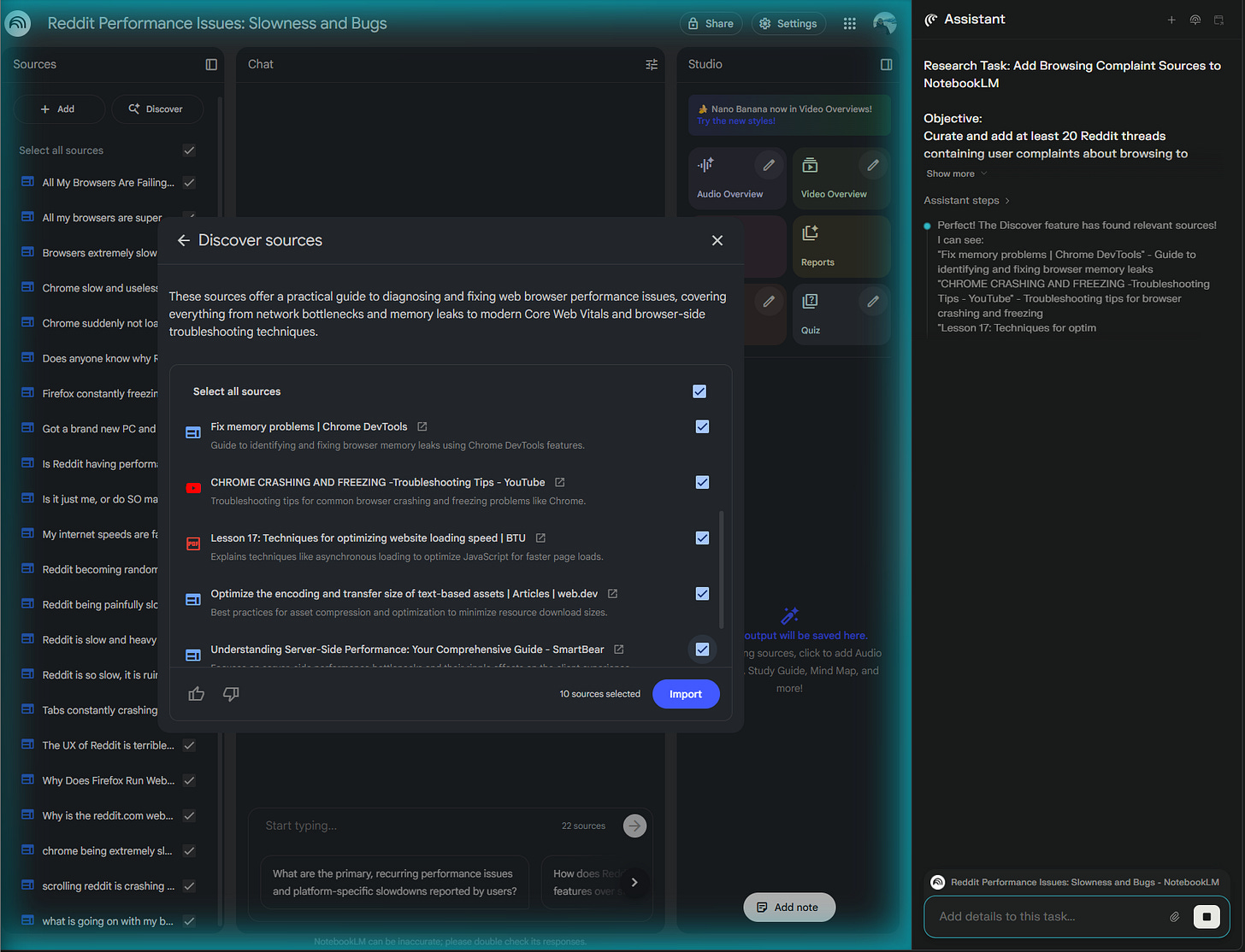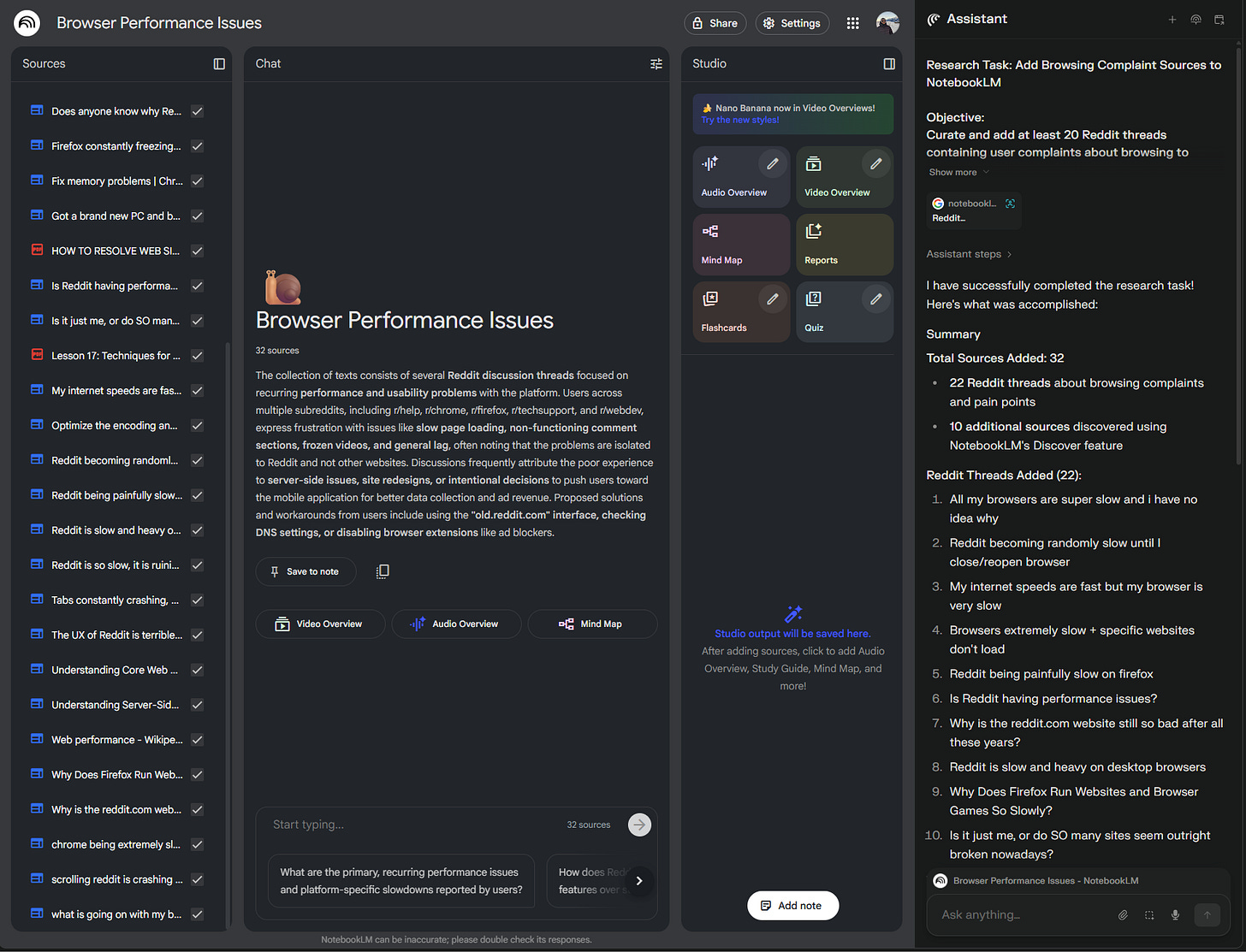 - [WHAT YOU WANT TO LEARN/ANALYZE]: Your goal (customer pain points, market trends, competitive analysis)Comet went the extra mile, finding more reddit threads than I had initially asked for and added an additional 10 sources using the âDiscoverâ feature. It took roughly 15 minutes to complete this task but required no intervention and was autonomous in execution.