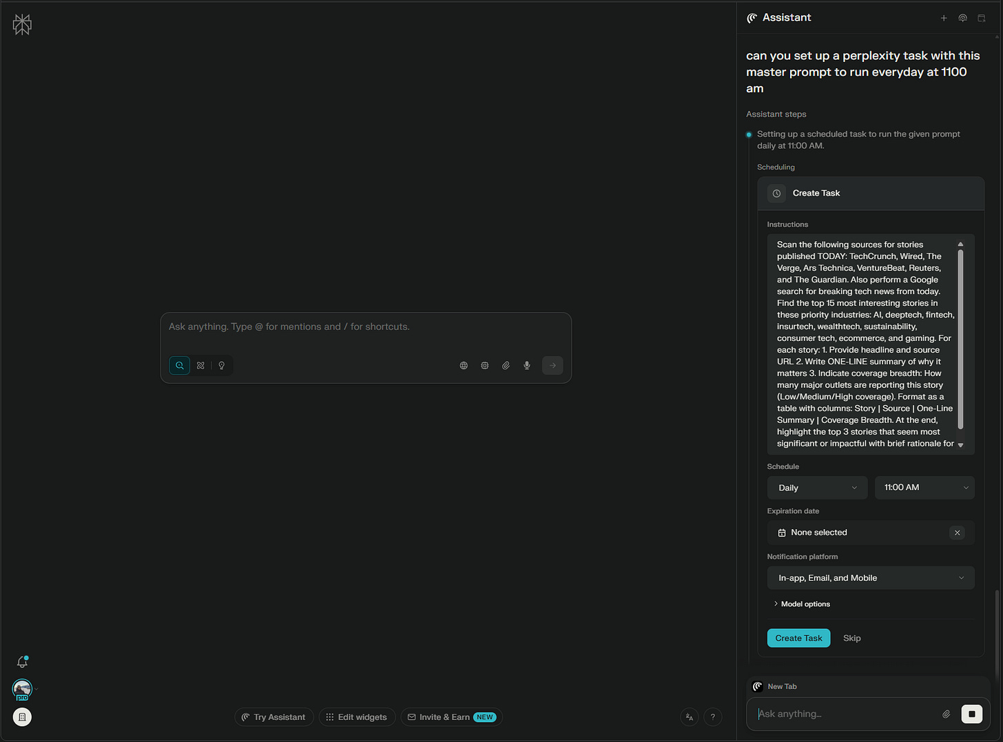 If youâre happy with the prompt results, you can convert it into a Perplexity âTaskâ to trigger this search on a periodic basis. This is quite straightforward as the functionality is directly linked with Comet.