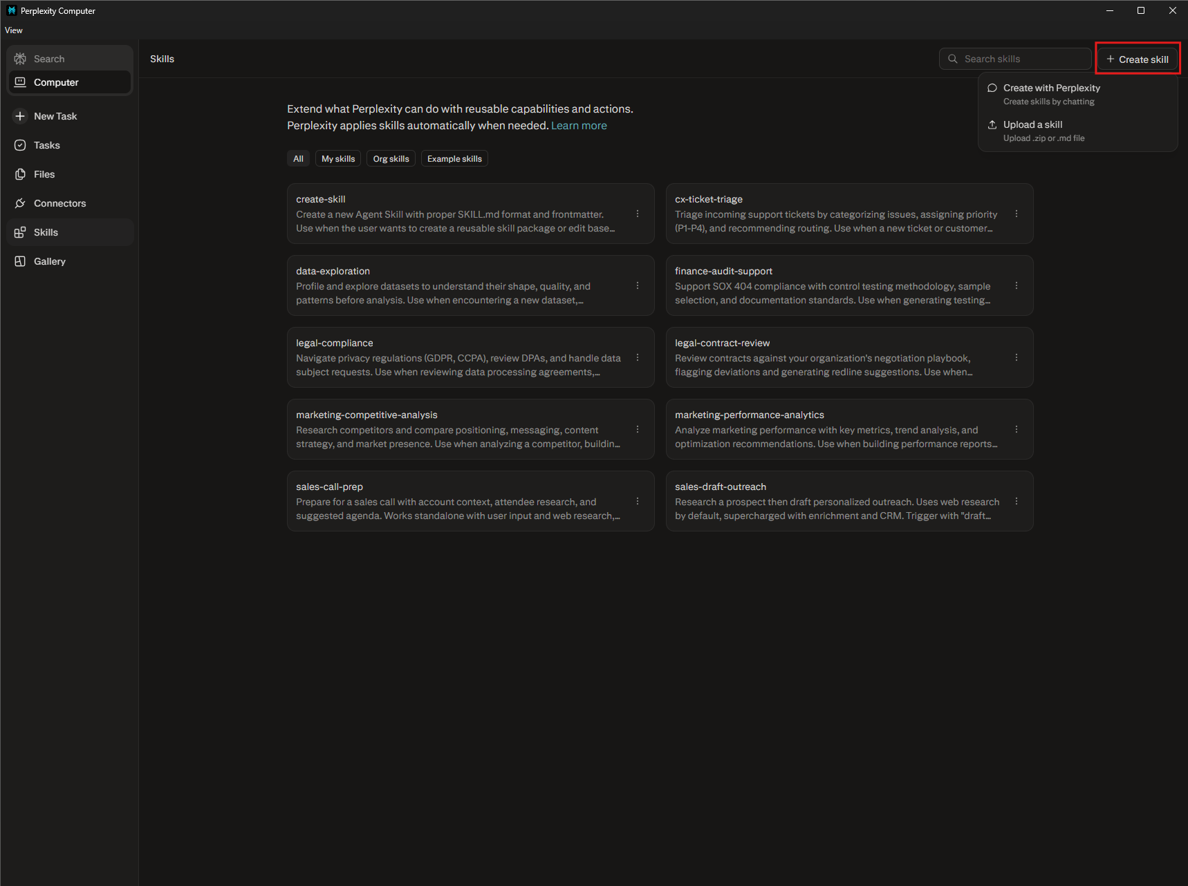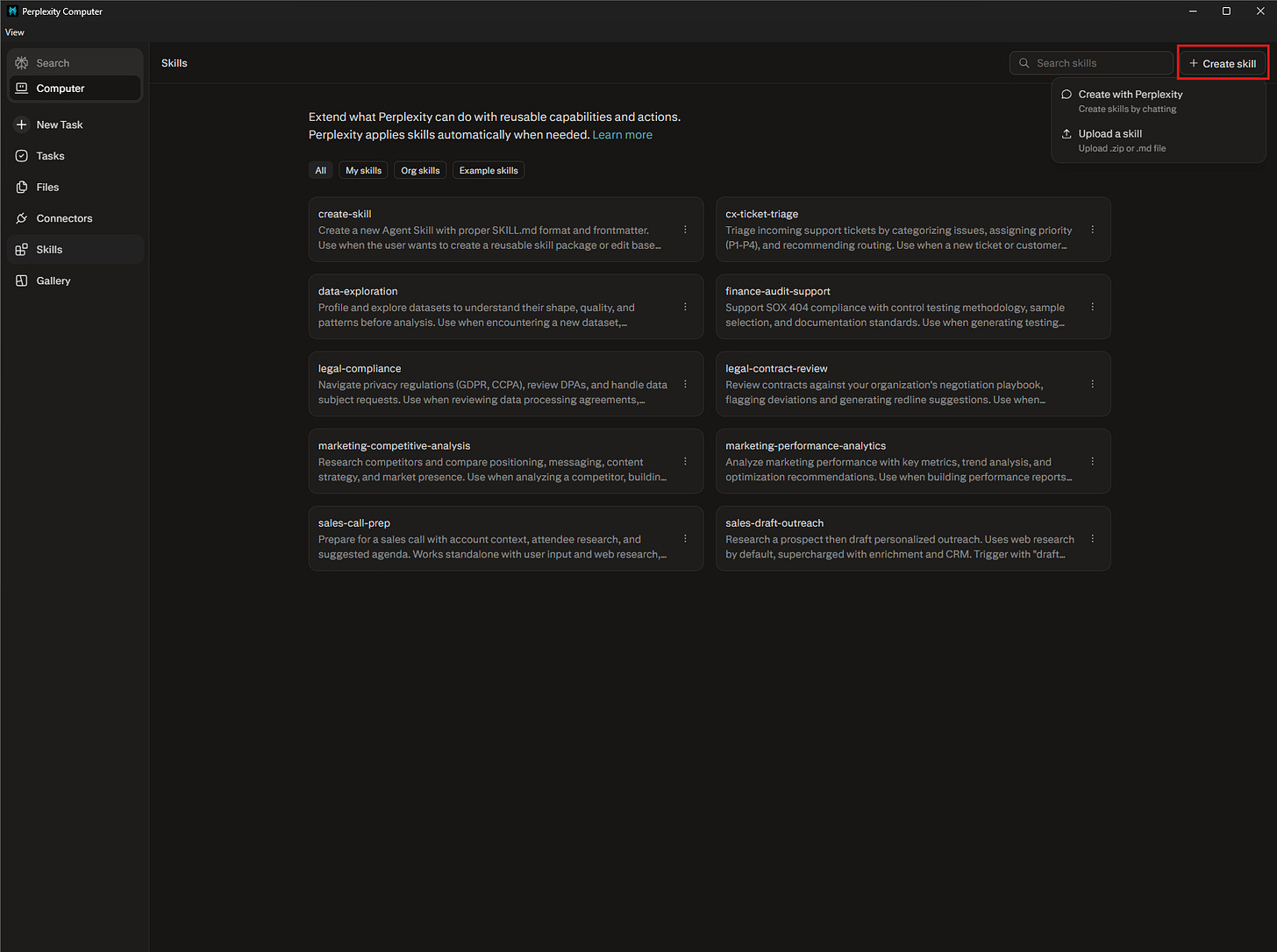 You can technically create a skill through conversation inside Computer, but don’t. That process consumes credits to generate something you could write in 5 minutes elsewhere. Use Perplexity Pro or another LLM to generate the .md file, then upload it directly.