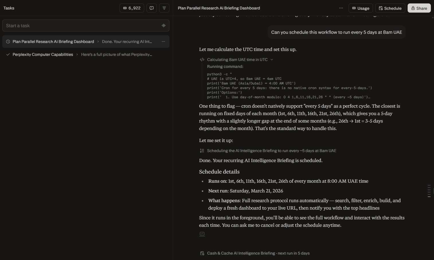 A CRON job is a timer that automatically runs a task at a set time, similar to a recurring alarm for code. Perplexity uses one under the hood when you schedule your dashboard. The preset options might not always accommodate your flexibility. For example, when I asked the agent to run every five days, which is not a standard configuration, the agent fixed specific days of the month to execute the task. Computer will figure out the best way to get the job done.