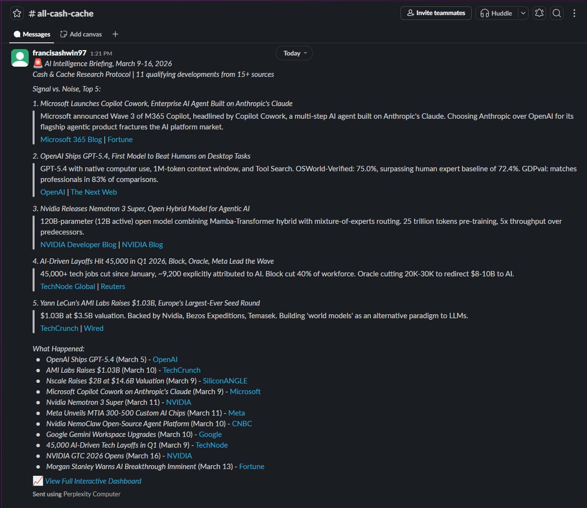 I wanted to see if Perplexity Computer could automate my daily market intelligence gathering practice and make the research process enjoyable. Instead of spending 30-45 minutes each morning reading through source after source, Computer runs 10 parallel sub-agents across all of them at once, filters by a set of criteria I defined, and produces a ranked report.