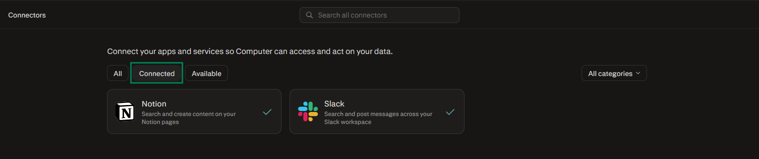 Computer connects to 400+ apps through Connectors. Click Connectors in the left sidebar to see what’s available. Once you complete the authentication step required to confirm access to the external tools, you should be able to see the connected tools under the tab shown.